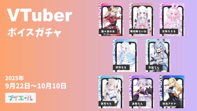 ニュース 【VTuberボイスガチャ】8名によるオリジナルボイスが期間限定で販売決定! 2025-09-19 ブイエール編集部 https://v-yell.jp/wp-content/uploads/2022/04/vyell.png ブイエール